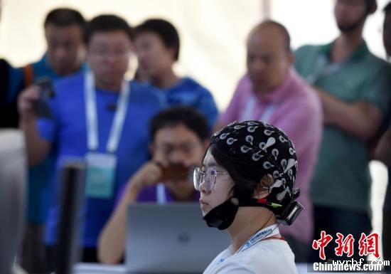 一名参赛选手在2019世界机器人大赛“BCI脑控机器人大赛”比赛中。