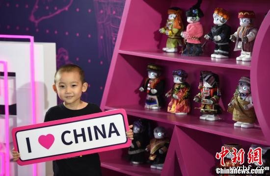 8月23日,一名小朋友在“民族风”机器人展区与展品合影。当天,2019世界机器人大会继续在北京亦创国际会展中心举行。(中新社记者 侯宇 摄)