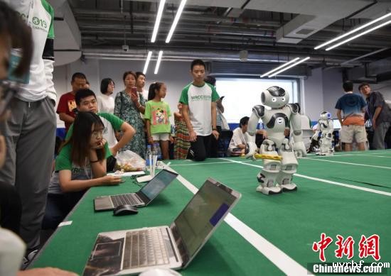 小选手们在2019世界机器人大赛“青少年机器人设计大赛——绿茵小将赛”比赛中操控自己的机器人。