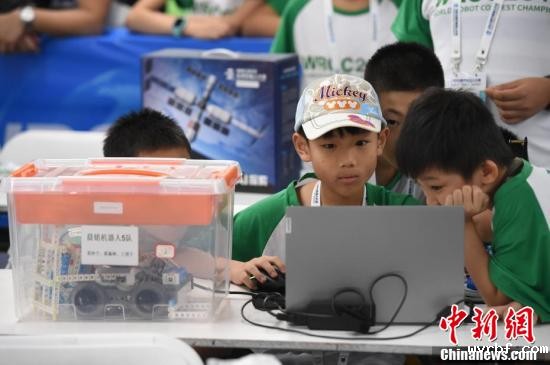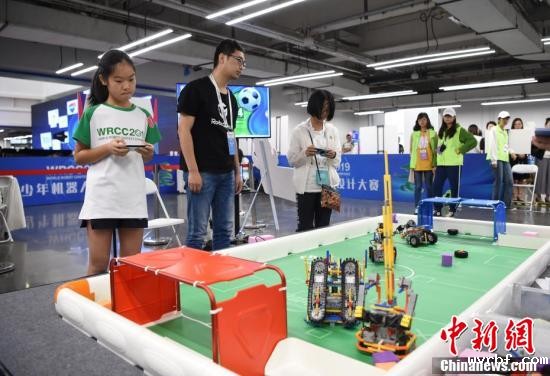 两名小选手在2019世界机器人大赛“青少年机器人设计大赛”中操控自己设计的机器人。