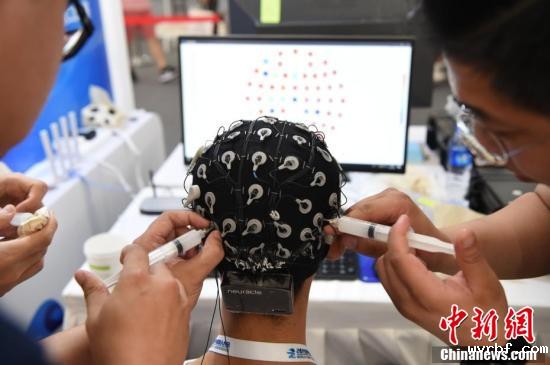 团队成员为一名参赛选手佩带的脑控设备注射导电膏,该选手即将参加在北京举行的2019世界机器人大赛“BCI脑控机器人大赛”。