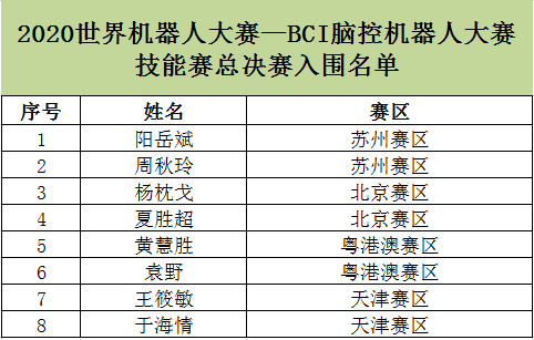 其中,入围2020世界机器人大赛—BCI脑控机器人大赛技能赛总决赛的名单如下: