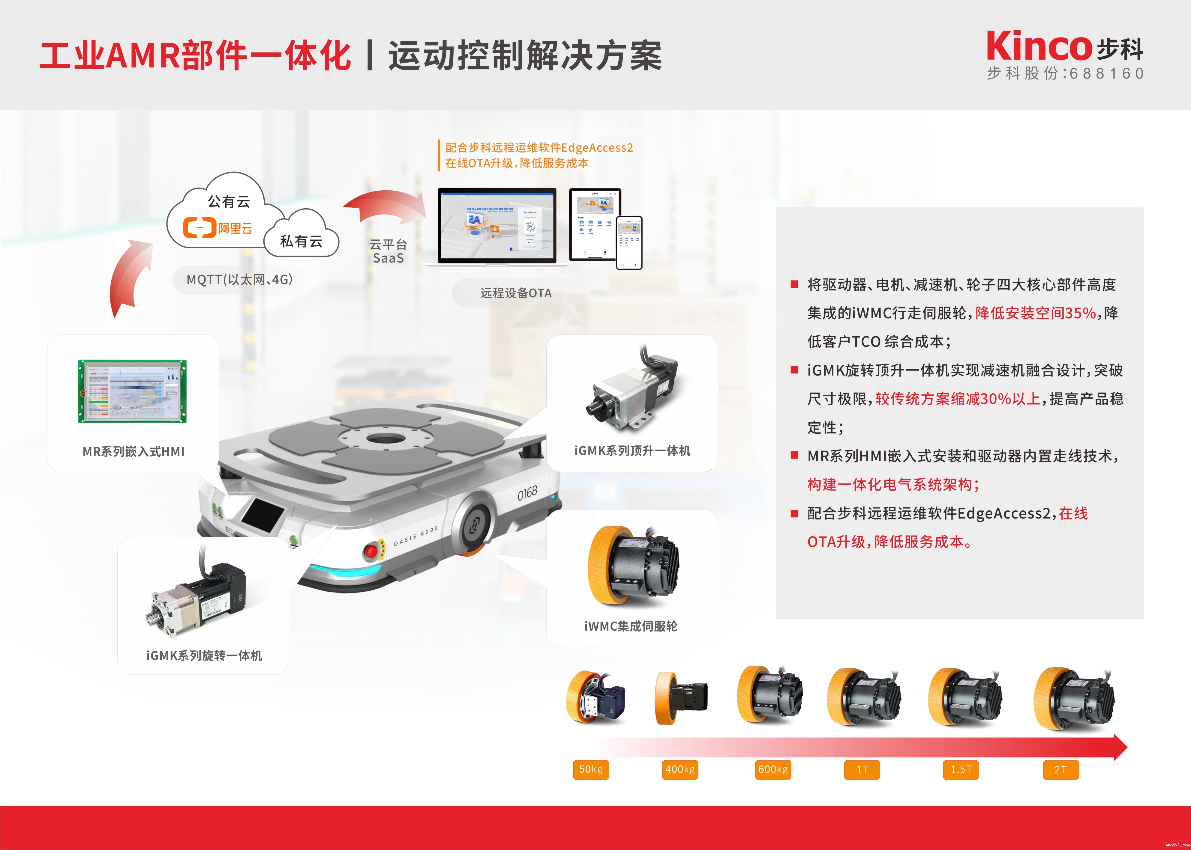 将驱动器、电机、减速机、轮子四大核心部件高度集成的iWMC行走伺服轮,降低安装空间35%,降低客户TCO 综合成本;iGMK旋转顶升一体机实现减速机融合设计,突破尺寸极限,较传统方案缩减30%以上,提高产品稳定性;MR系列HMI嵌入式安装和驱动器内置走线技术构建一体化电气系统架构;配合步科远程运维软件EdgeAccess2,在线OTA升级,降低服务成本。