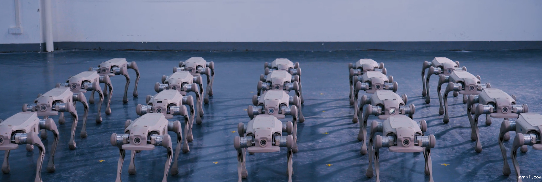 机械狗方阵集体卧倒一次(集体打招呼?有风险,可能会倒),起立,右(左)转身,从第一排开始逐排离场。
