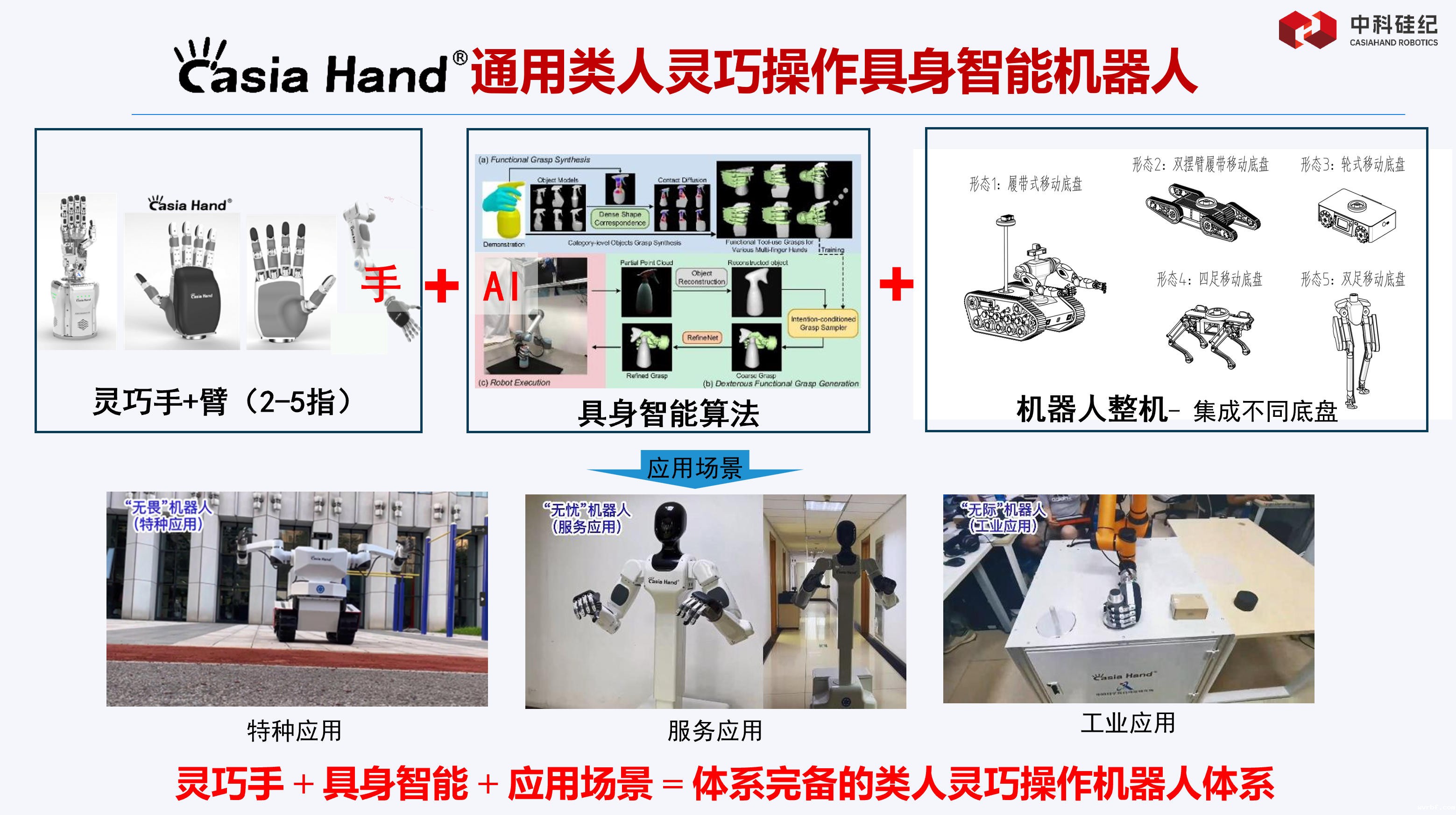 中科硅纪形成了涵盖“部件-算法-整机-训练场”的Casia Hand通用类人灵巧操作具身智能机器人完备产品体系。研发了面向工业和服务场景的“无际”机器人,以及面向特种场景的“无畏”机器人;建立了通用类人灵巧操作“大脑-小脑”协同具身智能算法体系;在领域内最早实现了灵巧手的系列化,结合不同应用场景形成了“高-中-低”自由度多个型号灵巧手,并推出了数据手套等数据采集和动作捕捉产品。