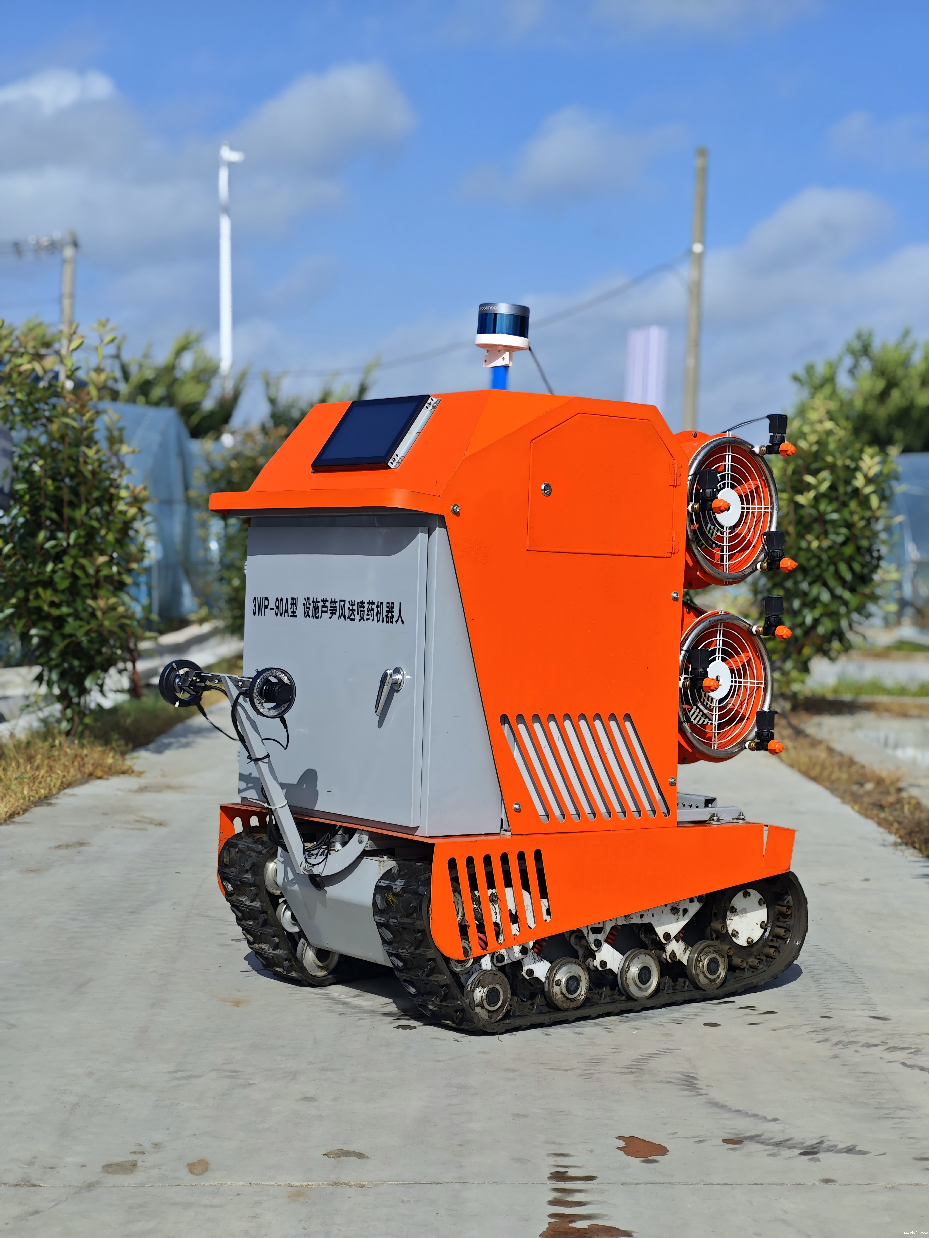 整机采用纯电驱动设计,主要有三大功能板块,①基于机器视觉的芦笋病害识别模块,可实时进行复杂环境下作物常见病害的识别、分级,并作出施药决策,实现基于病害严重程度的变量喷药作业;②基于SLAM的导航模块,可实现设施环境下自主无人植保作业;③支持风力调节的变量喷雾模块,喷雾系统设置四个独立风机,可根据冠层稠密程度调整不同风速,保证药液雾滴穿透冠层沉积均匀同时,减少漂移,节药增效。