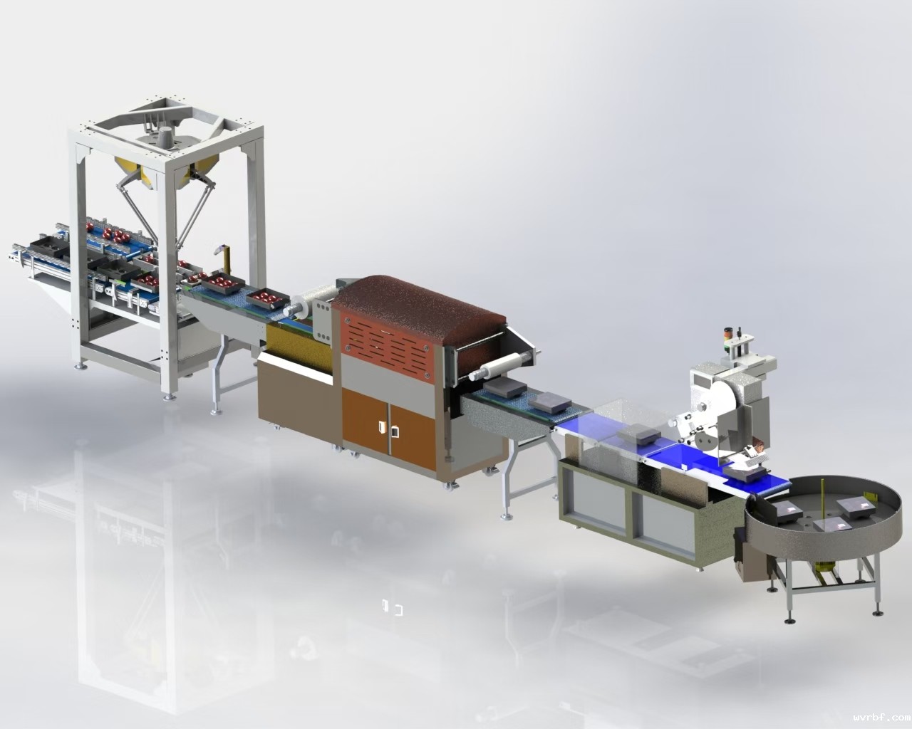 是一款针对类球形农产品(苹果、西红柿、大桃等)进行快速自动化精准装箱作业的机器人设备,具有全自动视觉辅助进料、果梗/花萼识别定位、箱体放果位置识别、多臂协同抓取包装、触摸屏显示操作界面、包装数据统计、远程监控等诸多功能。该机器人包装设备集空箱输送、物料输送、自动装箱、满箱输送、封箱为一体,也可以与贴标、打码、称重等其他包装系统配合。