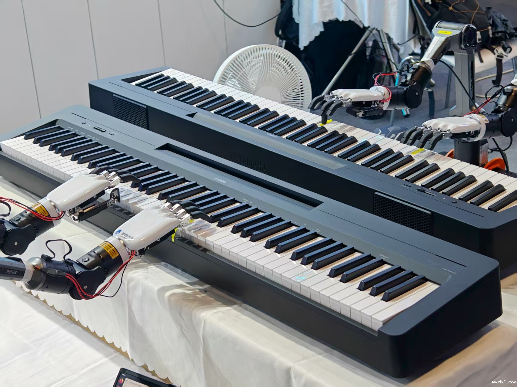 通过四条机械臂操控四只Linker Hand L6型灵巧手同时运动,在两部电子钢琴上进行高低声部的同时演奏,打造四手联弹的钢琴表演