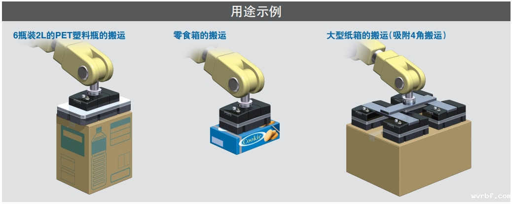 ・真空发生器单元(真空发生器、供给阀・破坏阀、消声器、压力传感器) ・仅需连接1根电线和气管,即可立即使用 ・对应4家公司的协作机器人 优傲、欧姆龙/TECHMAN ROBOT、FANUC、 安川电机 ・吸吊力: 440N(200×120)(-63kPa时);880N(300×180)(-63kPa时);2144N(400×240)(-75kPa时) ・对应IO-LINK