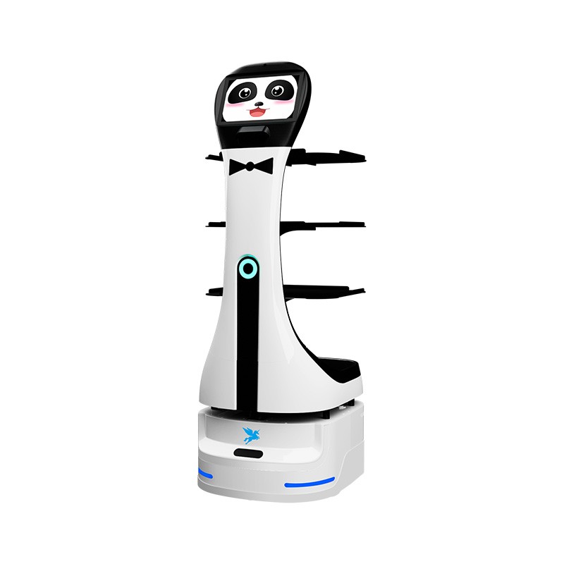 熊猫送餐机器人采用环保ABS材料,外观简洁大方,整机重量约43KG,运行稳定可靠。机器人内置先进的导航系统,能够自主规划路径,精准避障,确保送餐过程安全高效。餐宝还配备了多层托盘,可同时承载多份餐品,大大提高了送餐效率。