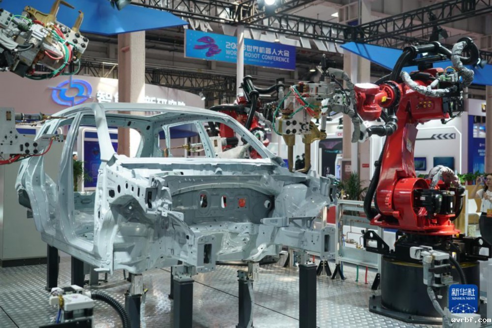 8月16日在2023世界机器人大会现场拍摄的白车身焊点机器人工作站。