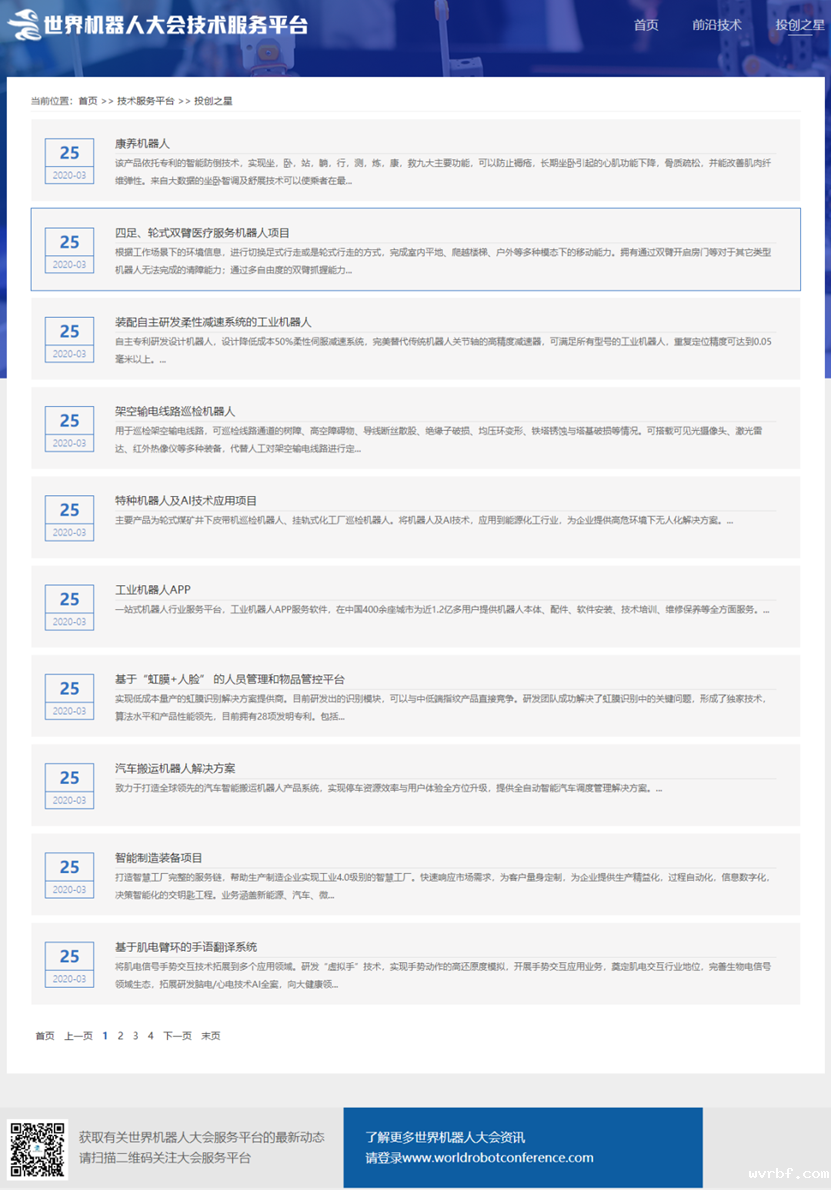 世界机器人大会(WRC)技术服务平台主要分为投创之星和前沿技术两个板块。